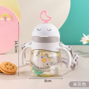 – Bình nước tập hút hình thú cho bé dung tích 250ml. Có van chống sặc + dây đeo + móc treo + tay cầm tiện lợi cho bé mang nước đi học, đi chơi.