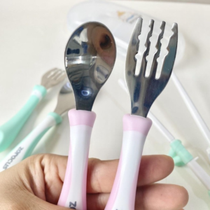 – Đầu gắp đũa và dĩa có “khứa răng cưa” không làm rớt đồ ăn khi gắp…. giúp bé thích thú và tự tin hơn trong việc tự gắp thức ăn.