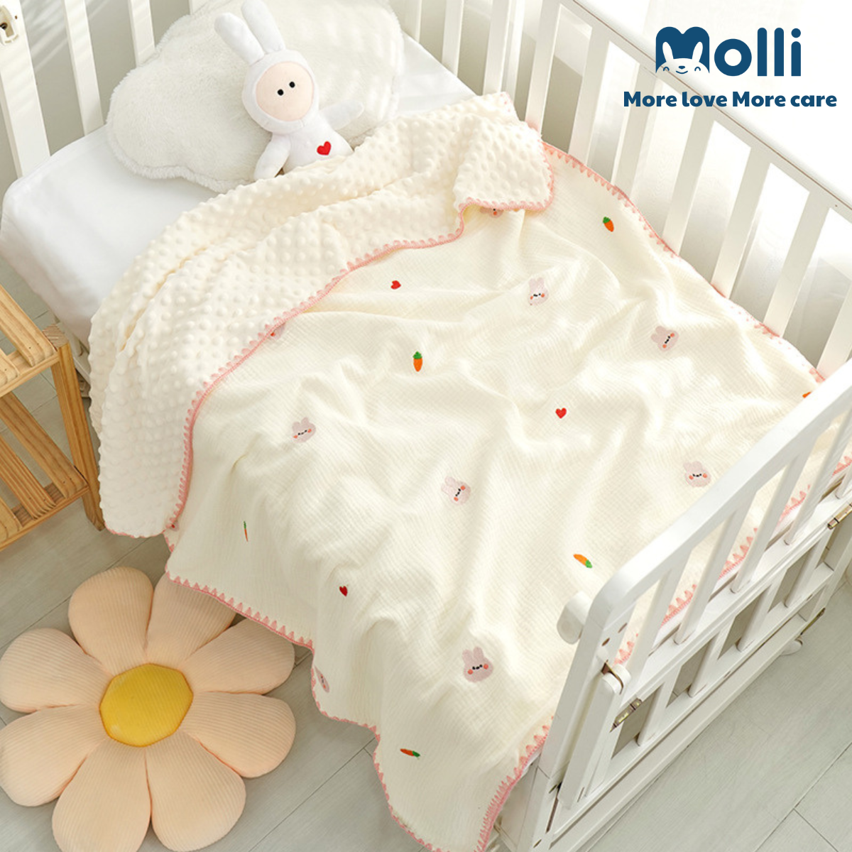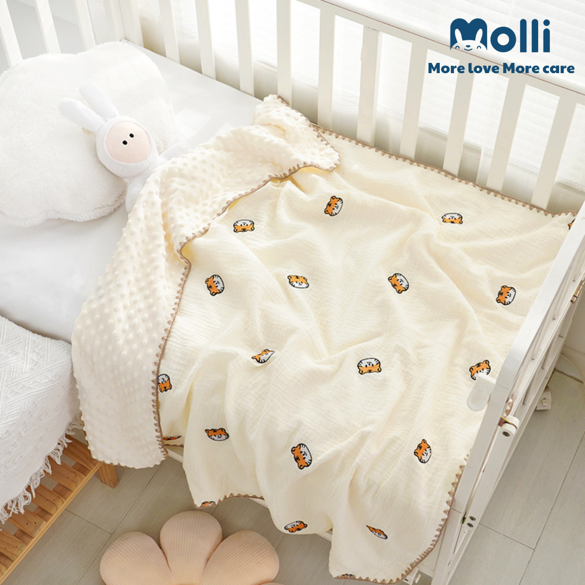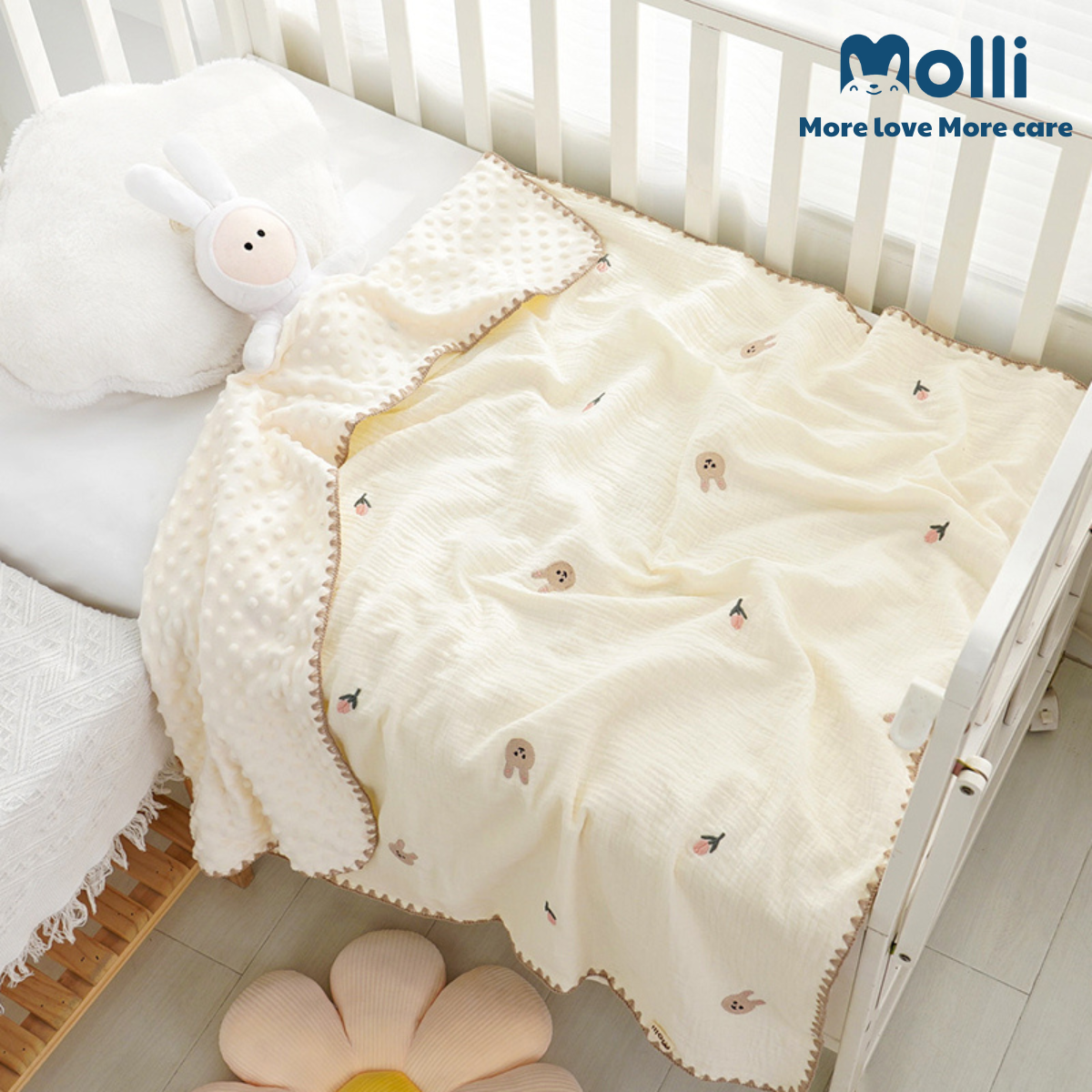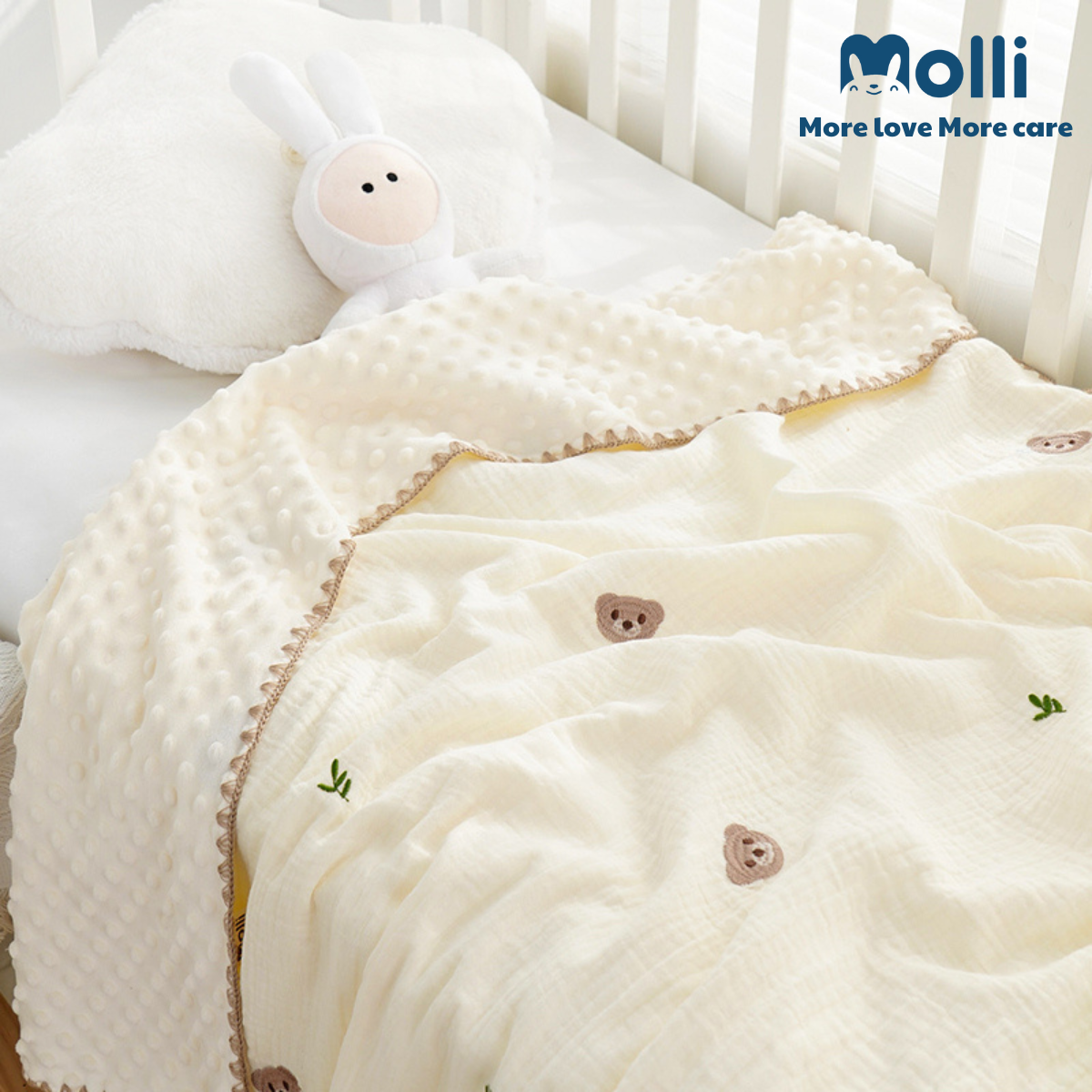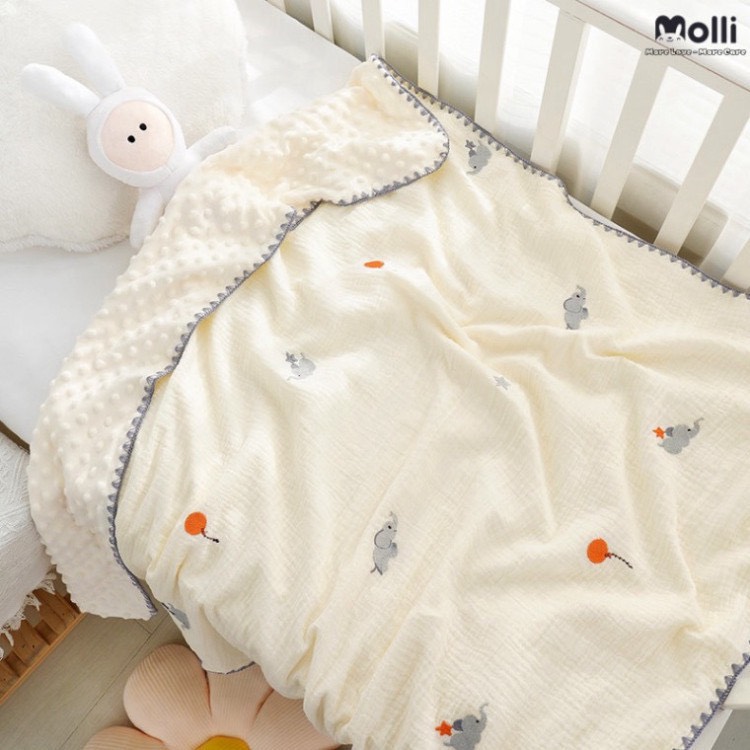 Chăn xô muslin hạt đậu thêu hình Molli kt 100x100cm