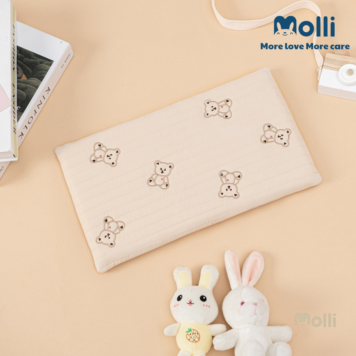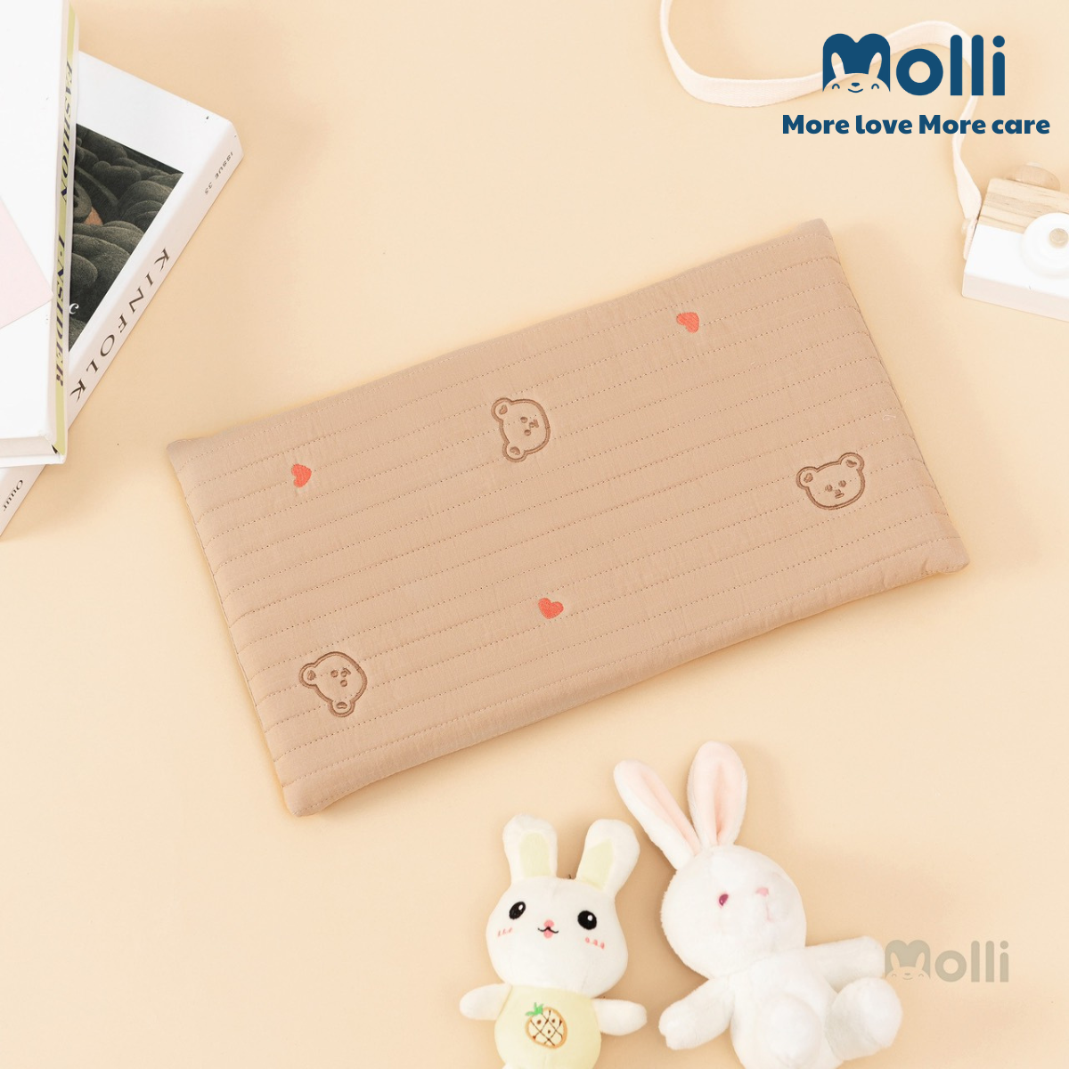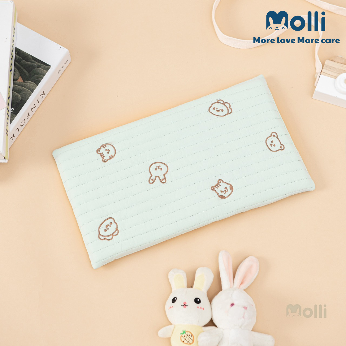 – Vỏ gối được làm 100% bằng vải cotton Hàn trần bông, có rãnh thoáng & bông siêu thấm hút. 100% bông đã được kháng khuẩn an toàn cho da của bé