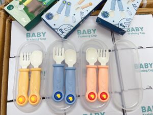 – Tay cầm của bộ thìa dĩa tập ăn cho bé được làm từ silicon giúp bé cầm nắm dễ dàng không bị tuột