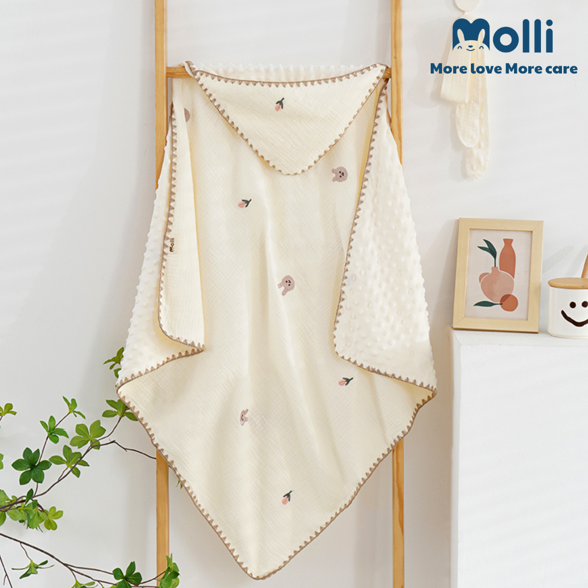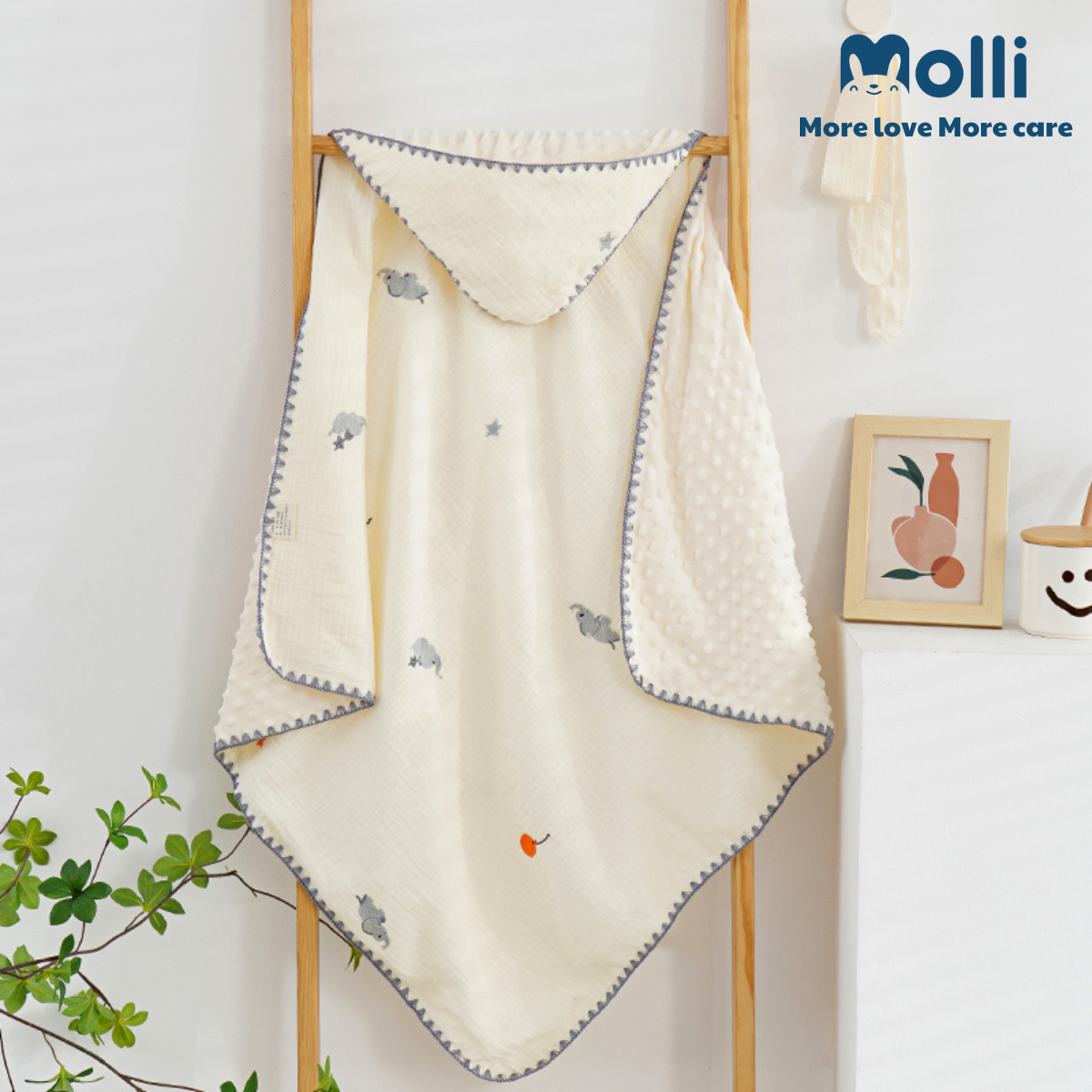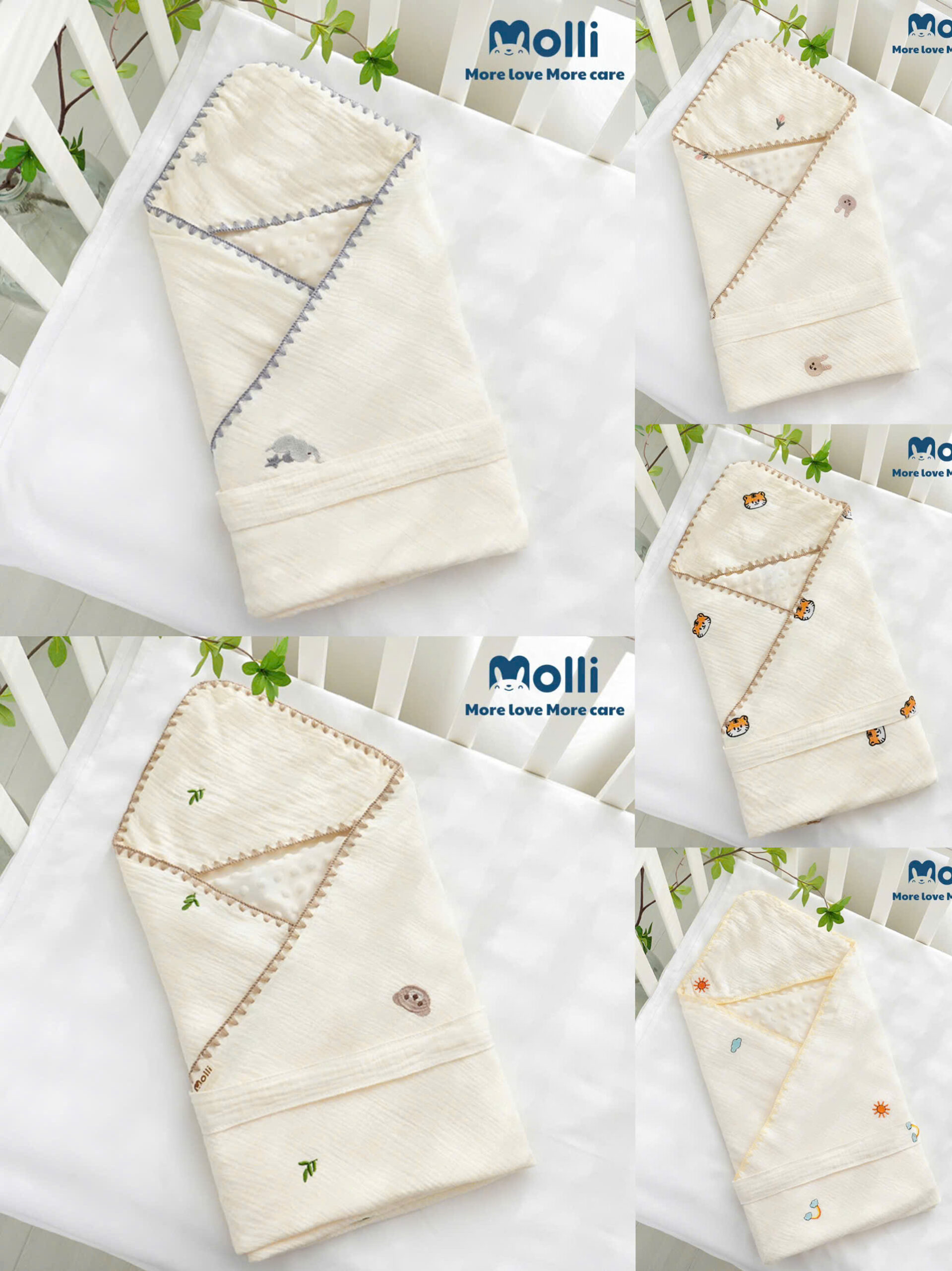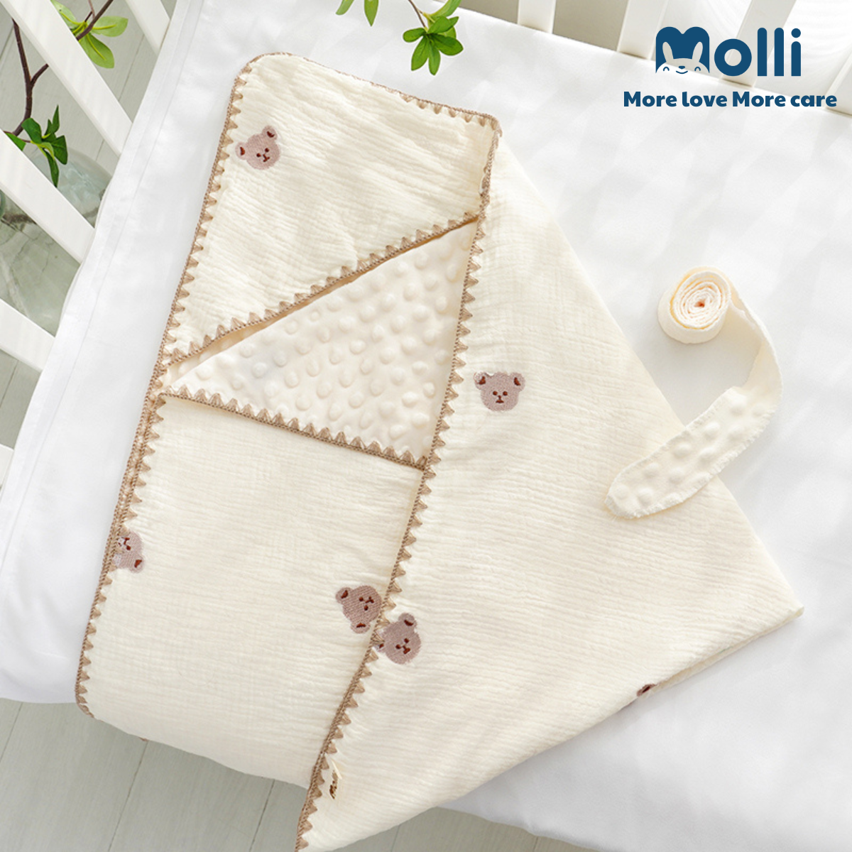 – Ủ xô muslin Molli mang lại cảm giác mềm mịn, thoải mái, dịu nhẹ với làn da bé, đặc biệt là các bé sơ sinh