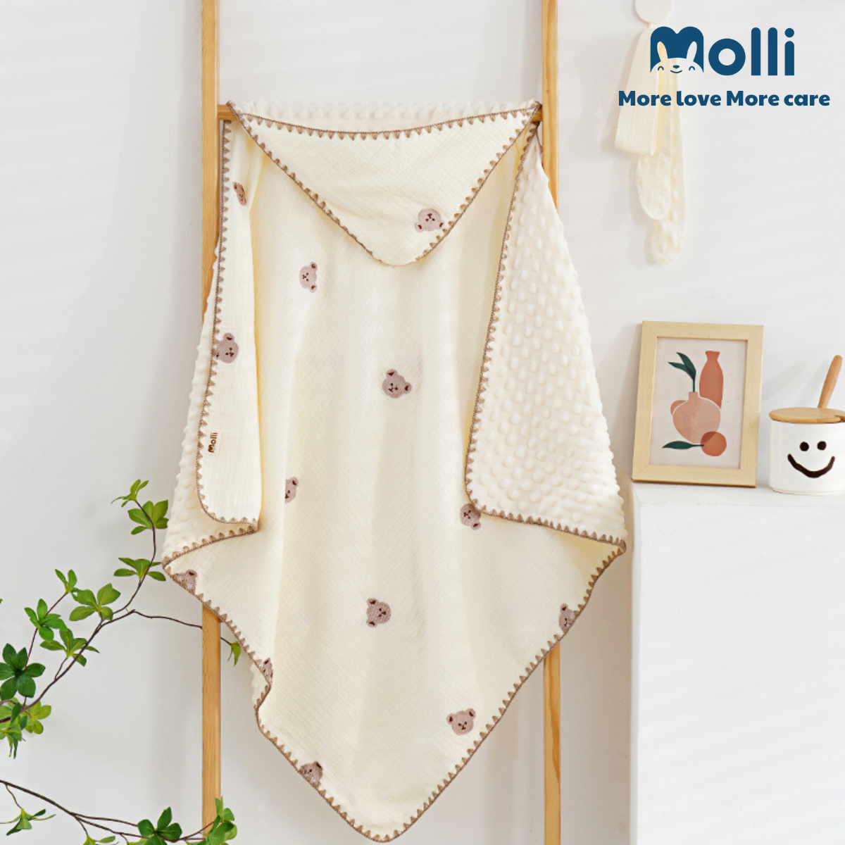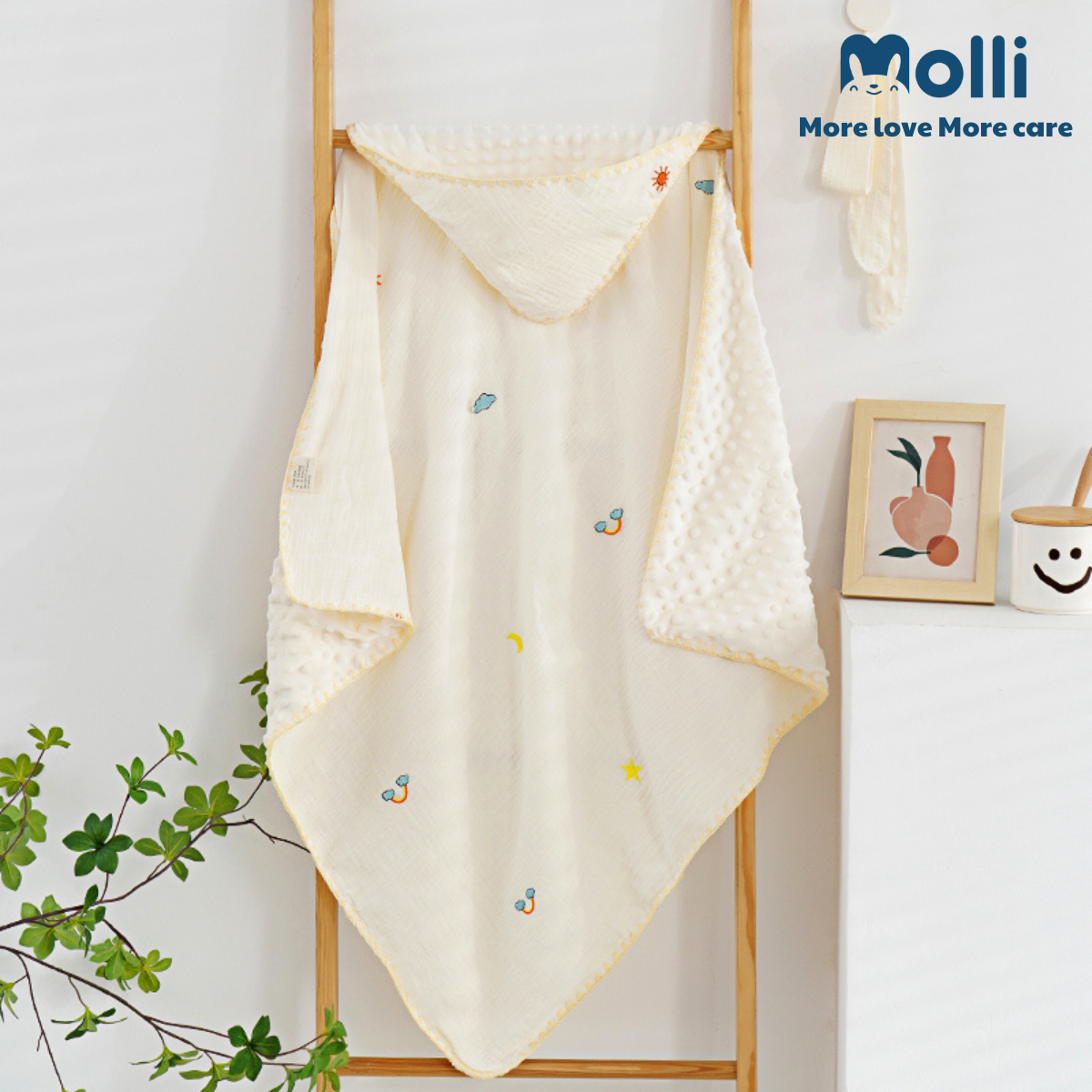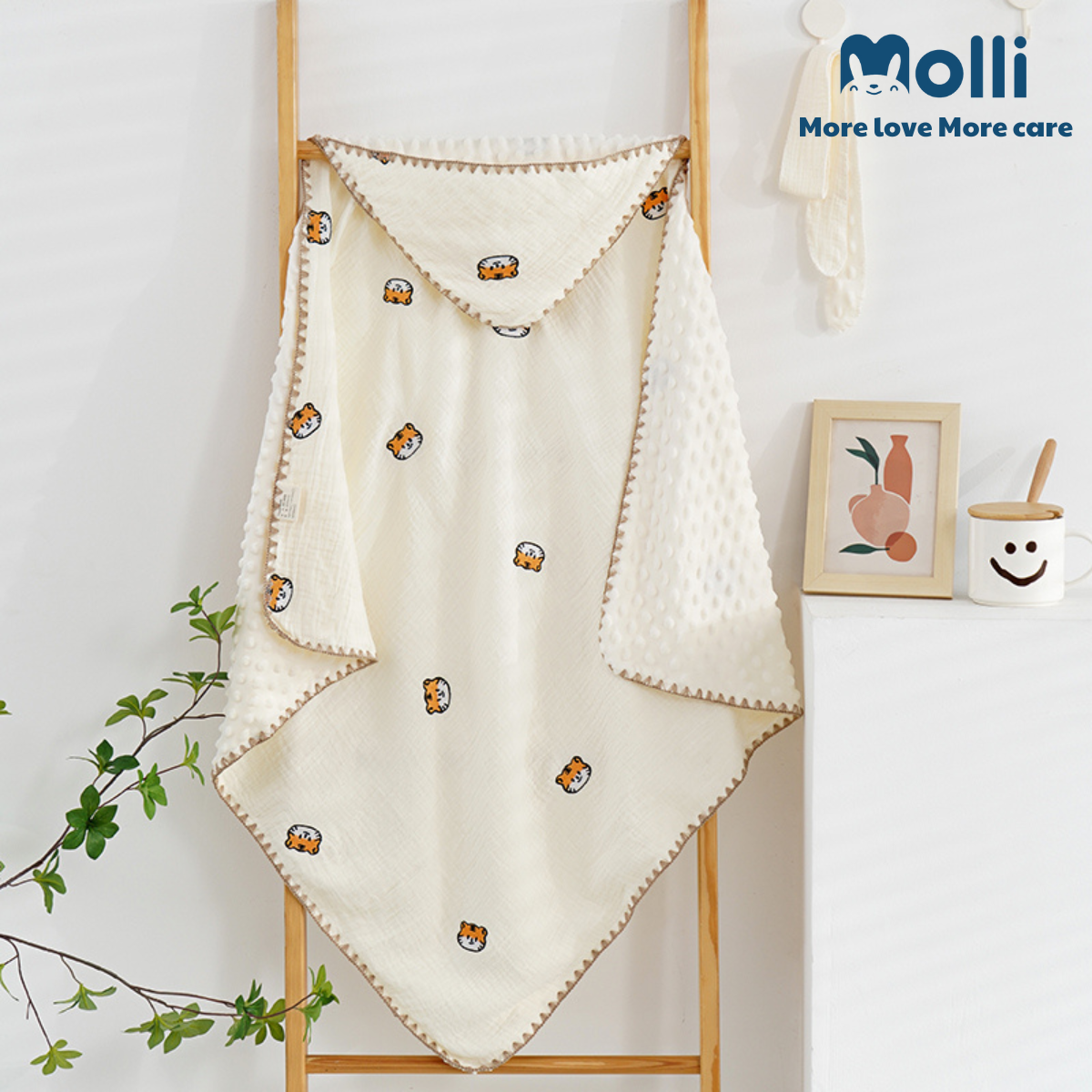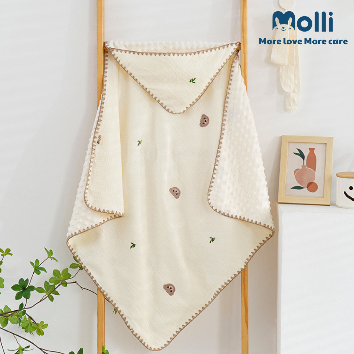 – Ủ xô muslin Molli mang lại cảm giác mềm mịn, thoải mái, dịu nhẹ với làn da bé, đặc biệt là các bé sơ sinh