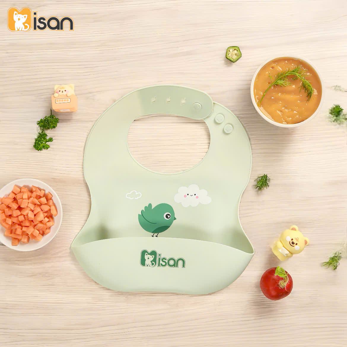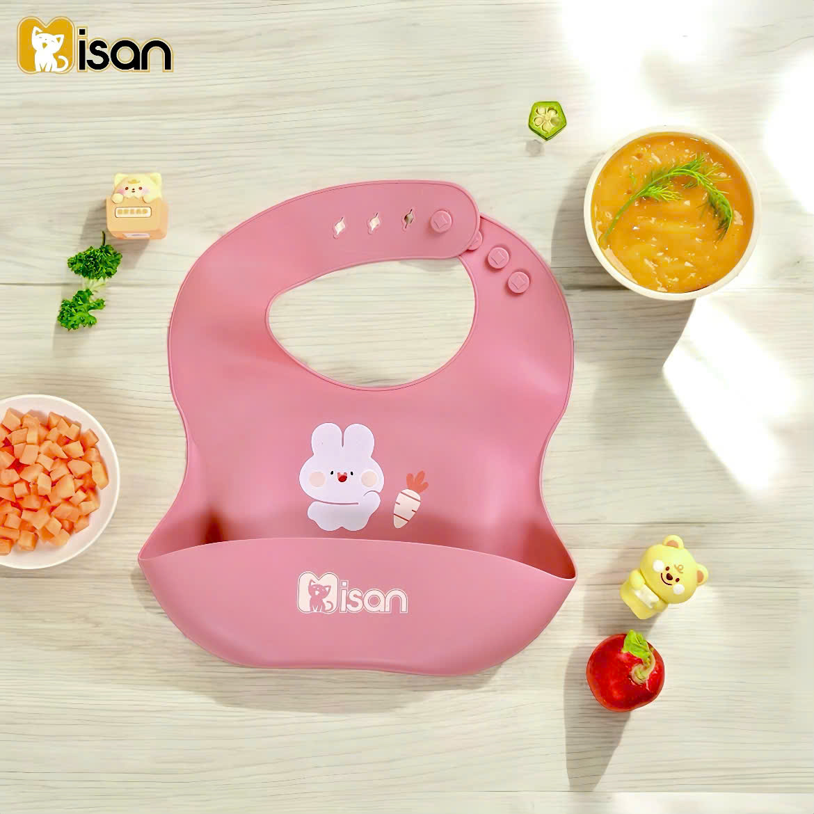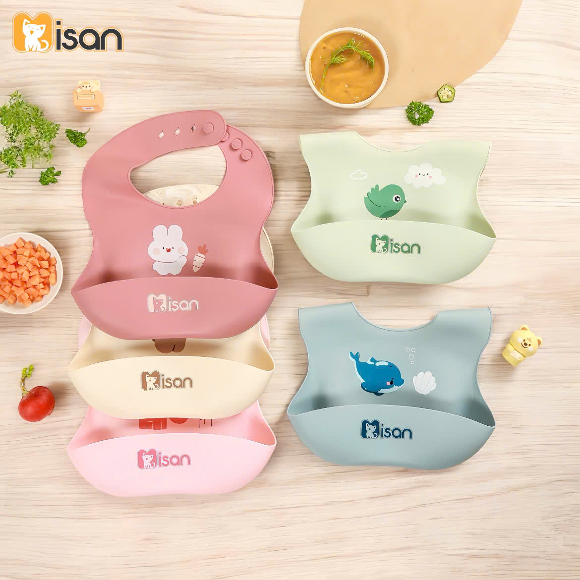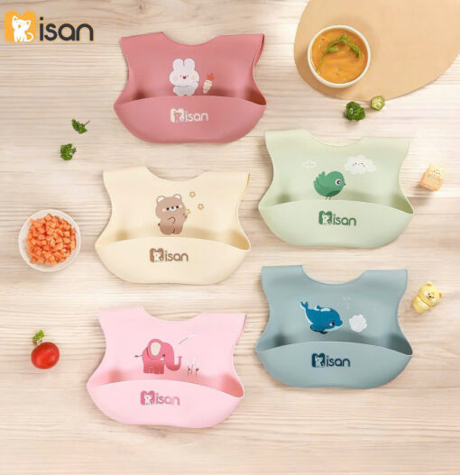 Màu sắc tươi sáng, đáng yêu: Yếm silicon Misan có nhiều màu sắc bắt mắt, với các hình ảnh ngộ nghĩnh, giúp bé hứng thú hơn trong mỗi bữa ăn.