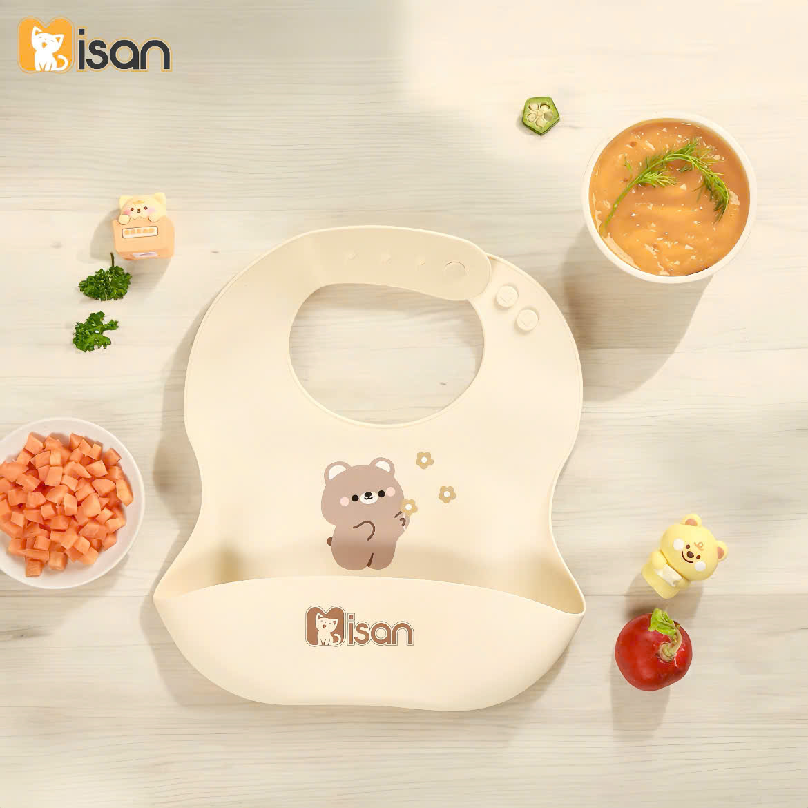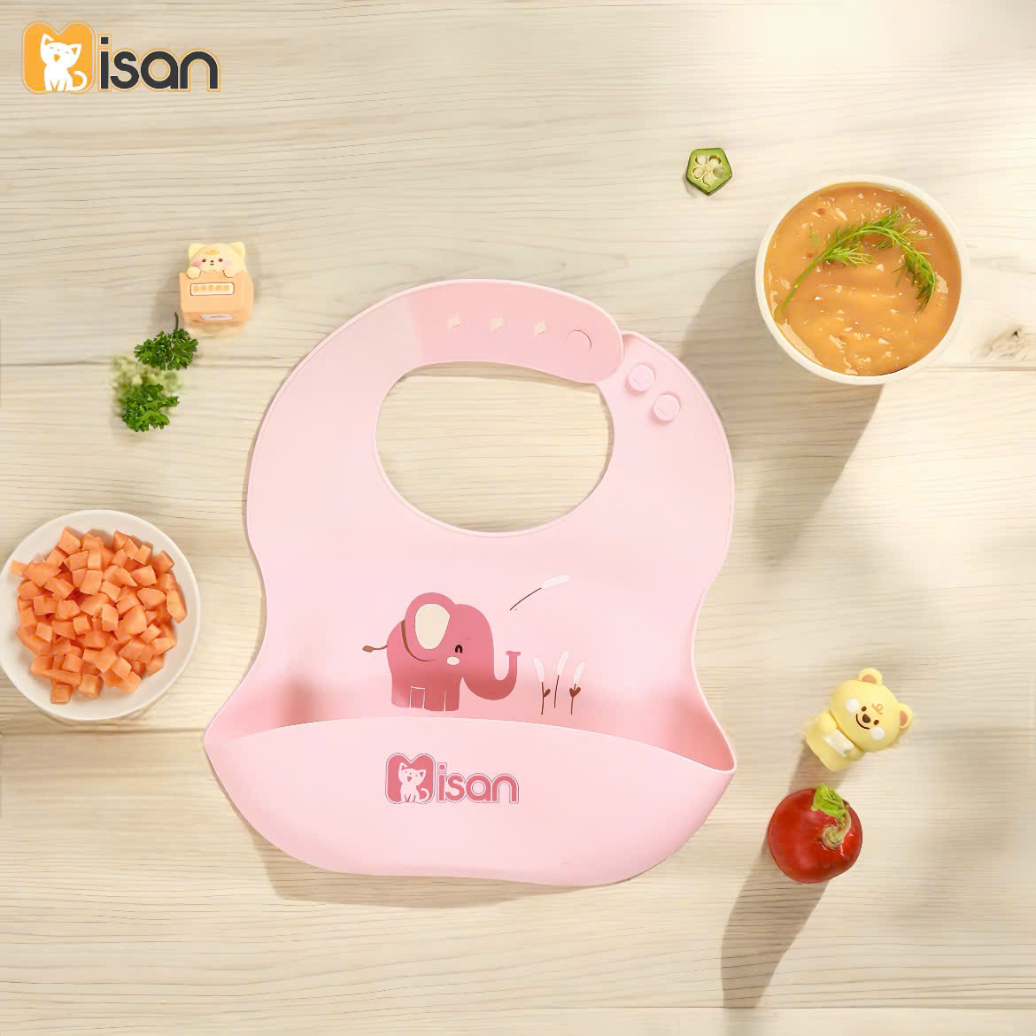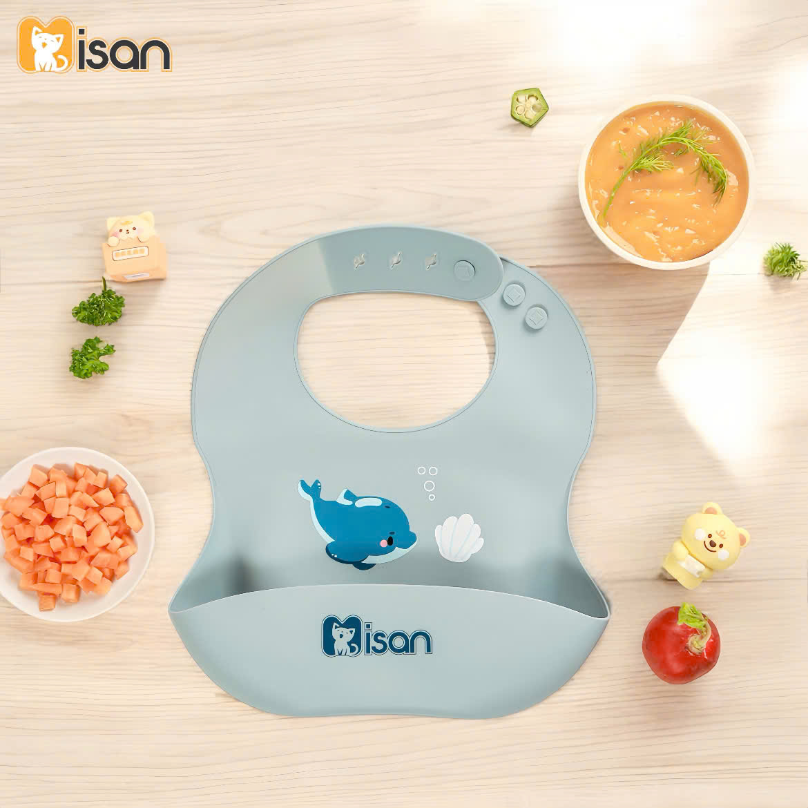 Màu sắc tươi sáng, đáng yêu: Yếm silicon Misan có nhiều màu sắc bắt mắt, với các hình ảnh ngộ nghĩnh, giúp bé hứng thú hơn trong mỗi bữa ăn.