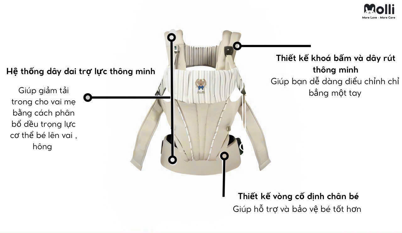 – Hệ thống dây đai trợ lực thông minh , giúp giảm tải trọng cho vai của ba mẹ bằng cách phân bổ đều trọng lực cơ thể bé lên vai và hông .