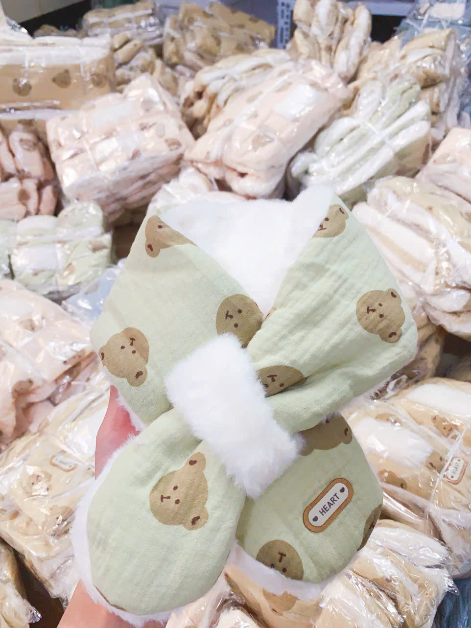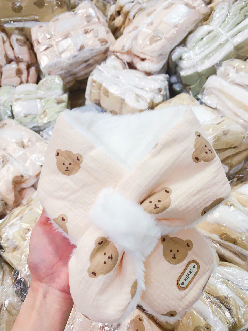 – Kiểu dáng: Khăn quàng cổ lông thỏ đính họa tiết hoạt hình cực kỳ xinh xắn