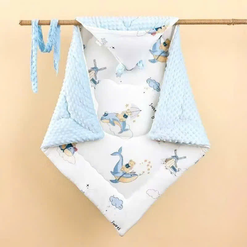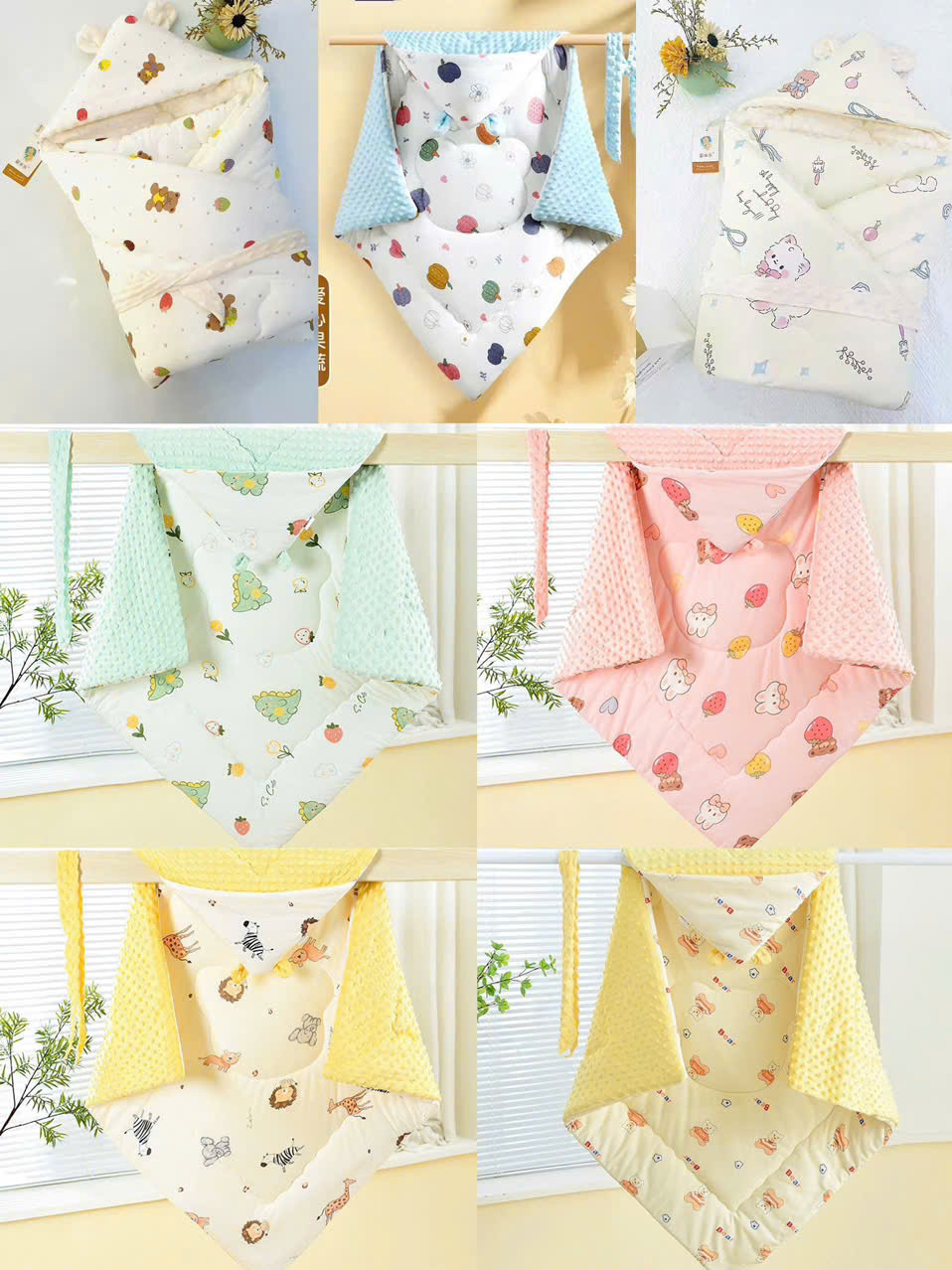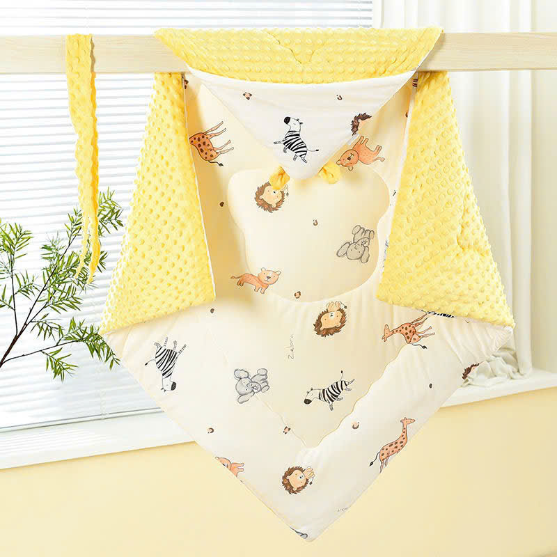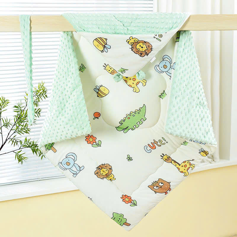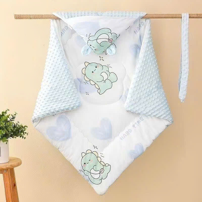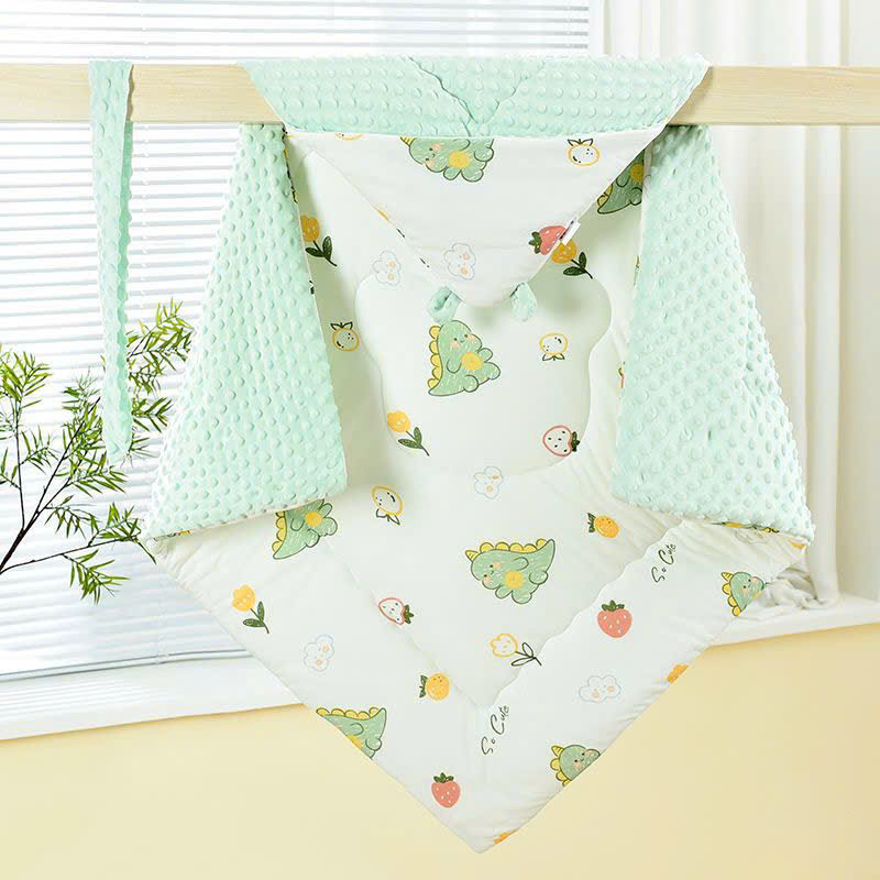 – Chất liệu: 2 lớp, mặt trước lớp vải xô. Mặt sau: lông mịn hạt đậu 100% sợi tổng hợp, tạo cảm giác thoải mái khi tiếp xúc với da bé. Giống như sự masage của mẹ